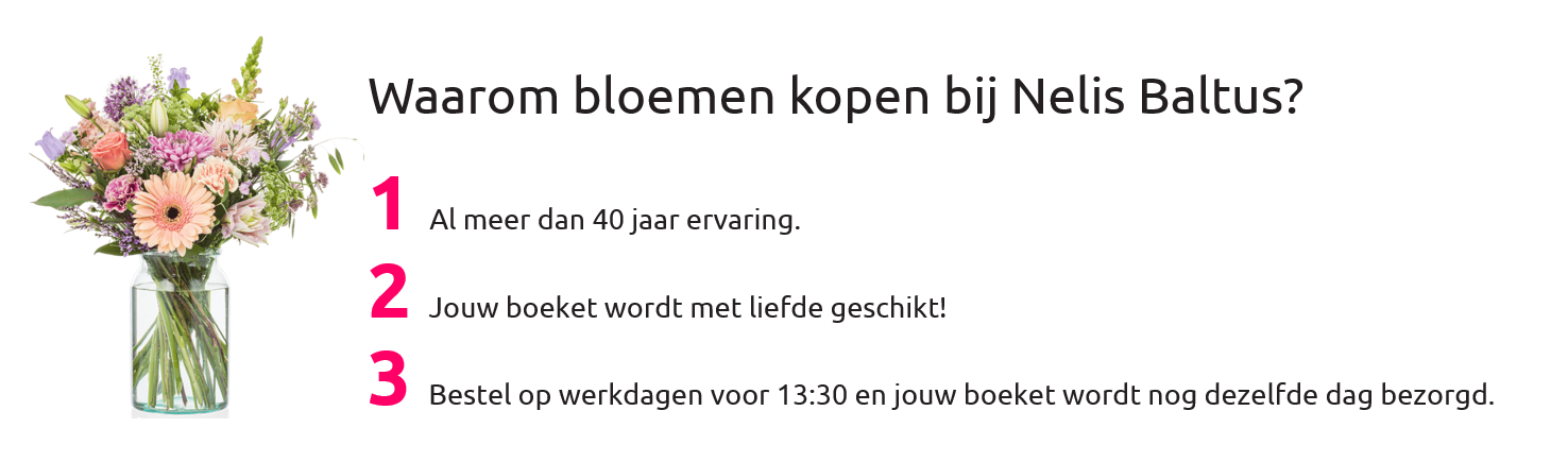 Bestel door de weeks voor 13:30 en op zaterdag voor half 11:30 en het boeket wordt dezelfde dag nog bezorgd.